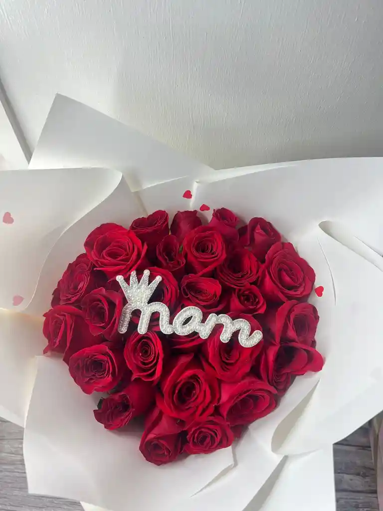 Ramo de 24 rosas con aplique MOM con piedras. Color de rosa a escoger entre: Rojo, rosado, blanco, amarillo, lila, según disponibilidad. Informar preferencia en el chat.