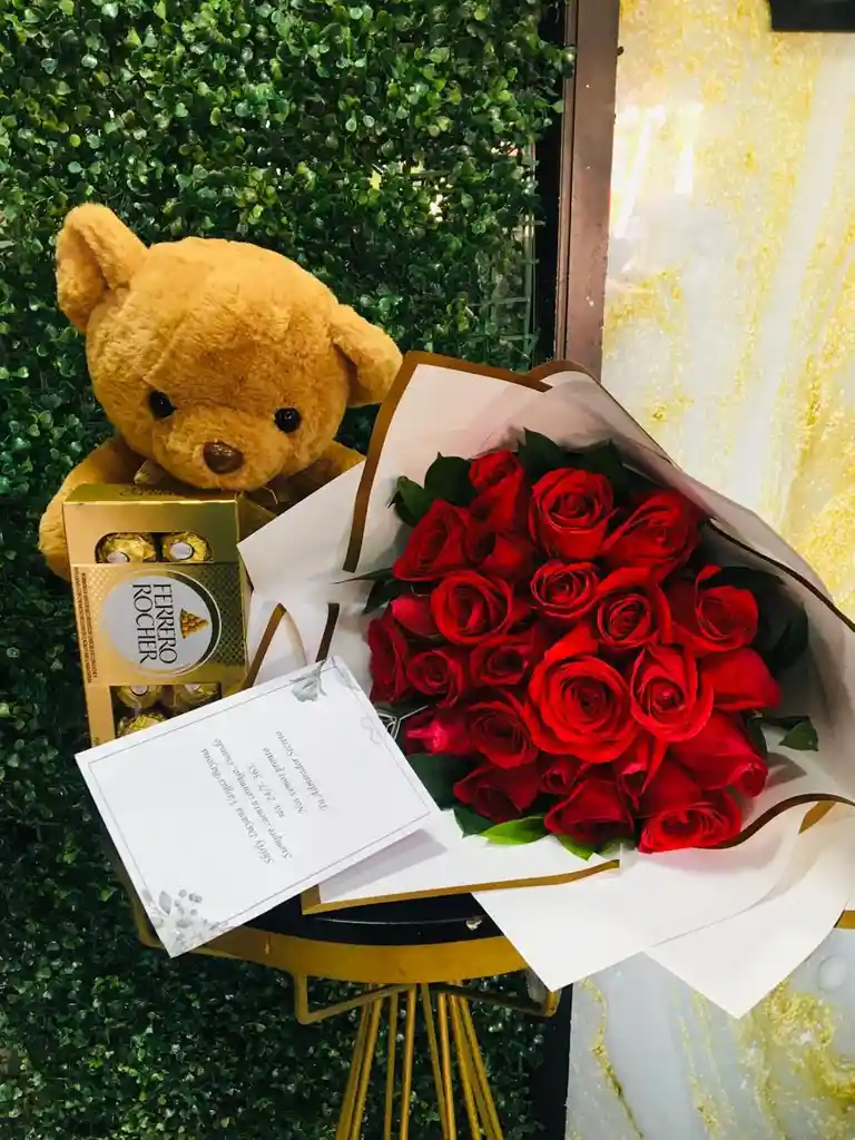 Bouquet 24 rosas rojas , ferrero x 8 peluche pequeño segun disponibilidad