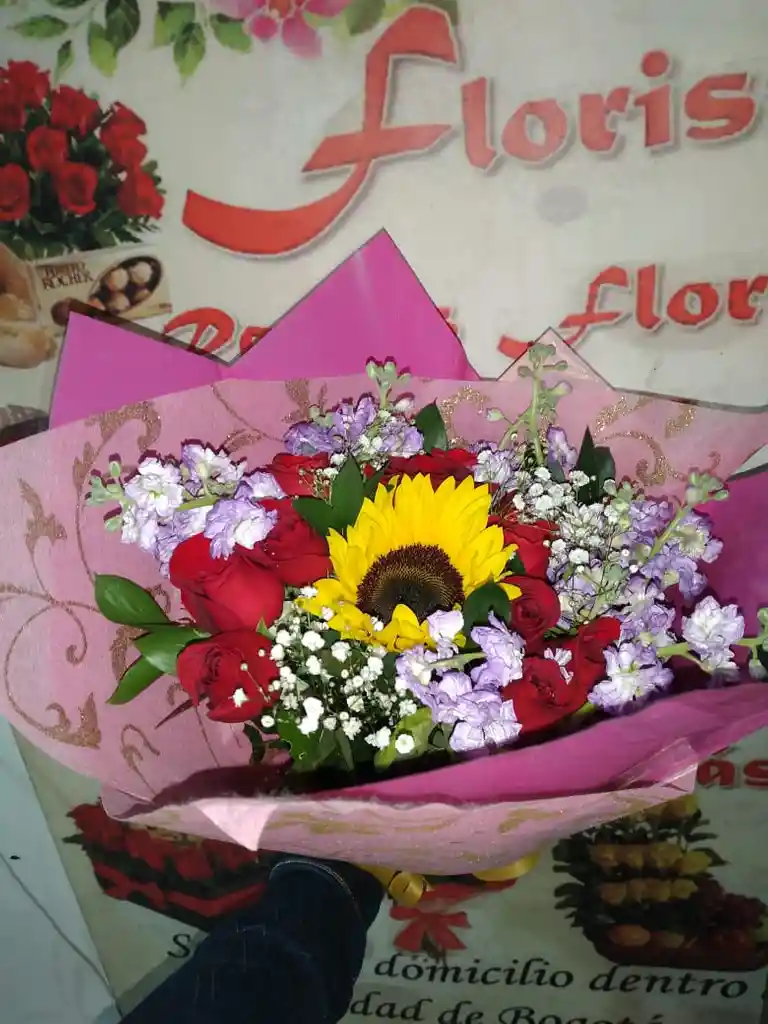 hermoso bouquet de 10 rosas rojas, girasol, yitsofilia y complemento, más empaque a disponibilidad