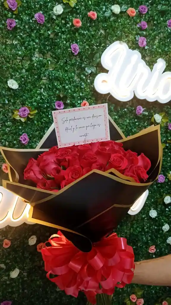 Regala momentos inolvidables con este hermoso bouquet de 36 rosas rojas perfectamente seleccionadas para una larga duración, envuelto en papel coreano color negro con bonito moño decorativo rojo y tarjeta dedicatoria personalizada.