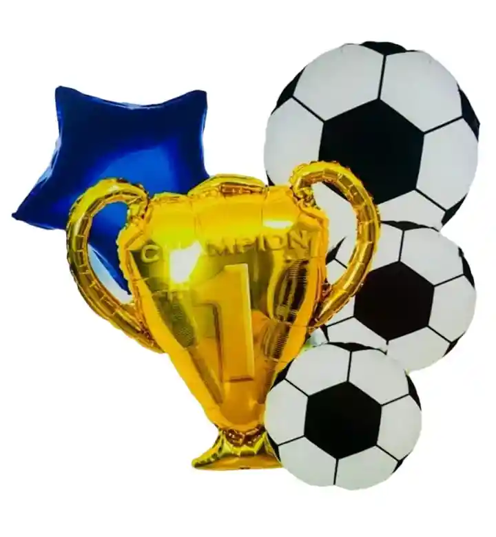 Bouquet x5 Globos Metalizados Copa Dorada Champion •1 Globo Copa Dorada 60cmcm •1 Globo Estrella 45x45cm •3 Globos Balones de Fútbol 45x45cm / Cada uno