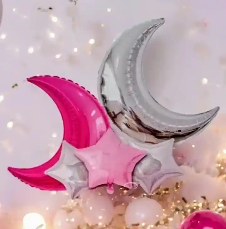 Bouquet x 5 Globos Metálicos Lunas y Estrellas plateado y fucsia Por tu compra llevas: •2 Globos Metálizados (71x40cm) c/u •3 Globos Metálizados Estrellas (45x45cm) NOTA •LOS GLOBOS SE ENVIAN DESINFLADOS