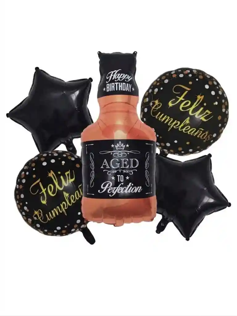 Bouquet Botella De Licor Con Mensaje de Feliz Cumpleaños Incluye: 1 Globo Metalizado Botella de Licor, 2 Globos Metalizados Estrellas Negras, 2 Globos Estampados de FELIZ CUMPLEAÑOS. SE ENVIA DESINFLADO. Para inflar sus globos metalizados y de látex, tenemos disponible en nuestra tienda el INFLADOR MANUAL. No olvide incluirlo en su pedido