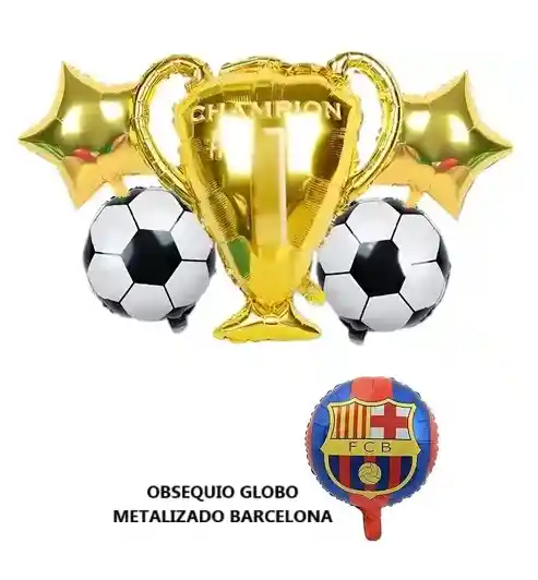 🎈 Bouquet de Globos Metalizados por 5 Piezas de motivo Copa de Futbol Incluye obsequio de un globo metalizado redondo de motivo Barcelona Futbol Club ⚠️ Se envía desinflado. Se puede inflar con aire o helio 🎈Para inflar sus globos metalizados o globos de látex, tenemos disponible en nuestra tienda el INFLADOR MANUAL. No olvide incluirlo en su pedido