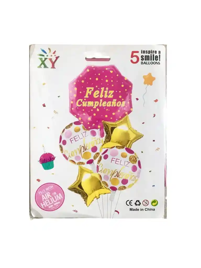 Contiene 1 Globo Rosado Con Letras Feliz Cumpleaños Doradas, 2 Globos Estampados Metalizados Feliz Cumpleaños y 2 Estrellas Metalizadas Color Dorado. SE ENVIA DESINFLADO. Para inflar sus globos metalizados y de látex, tenemos disponible en nuestra tienda el INFLADOR MANUAL. No olvide incluirlo en su pedido