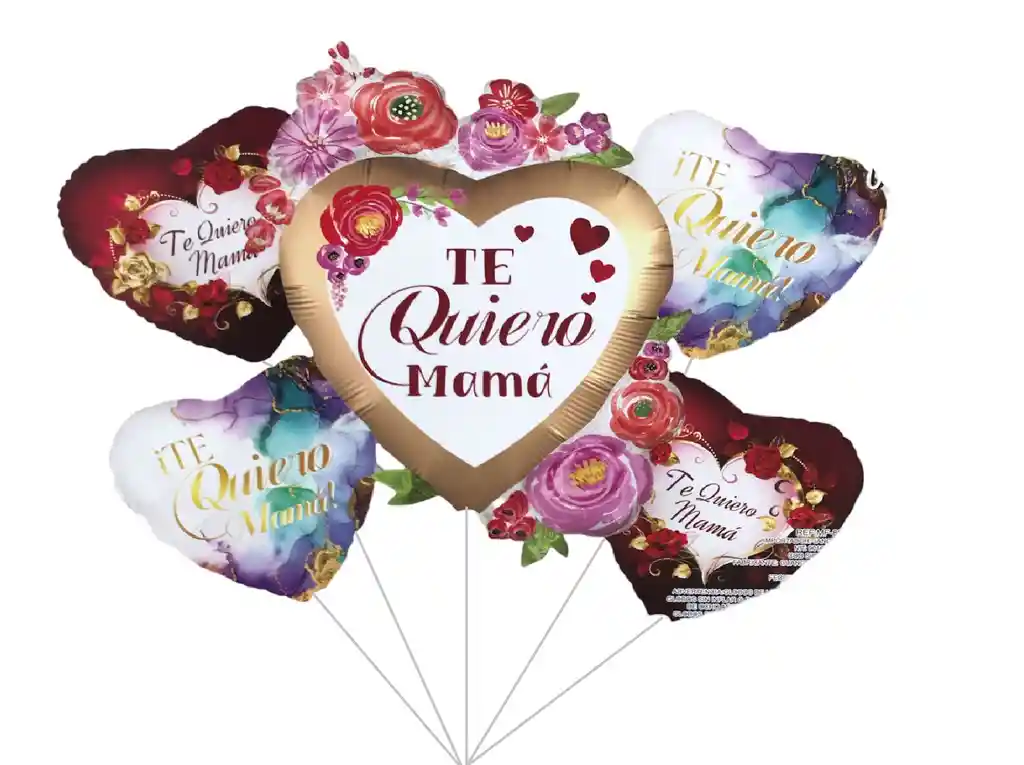 🎈 Bouquet Globo Metalizado Te Quiero Mama. Contiene 5 globos inflables de corazon colores surtidos
