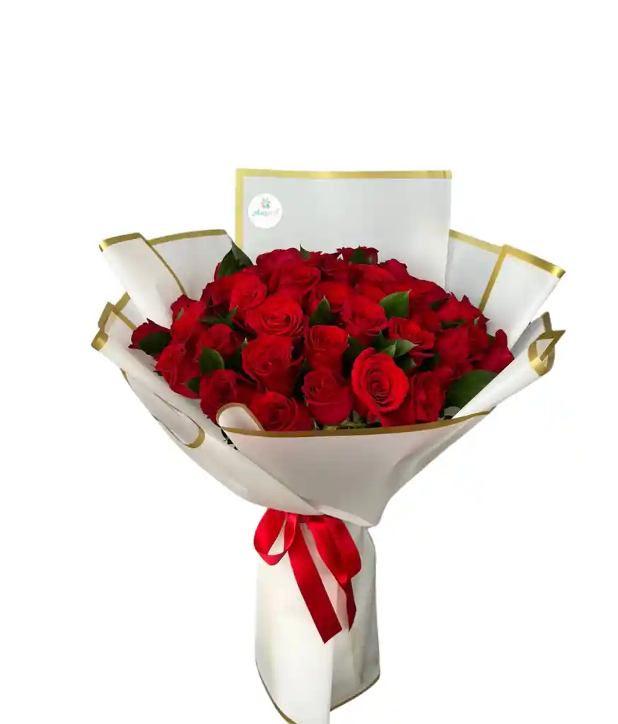 Hermoso Bouquet de 50 rosas con follaje verde, papel decorativo con moño y tarjeta personalizada si el cliente lo desea. *El color de la rosa varia según disponibilidad