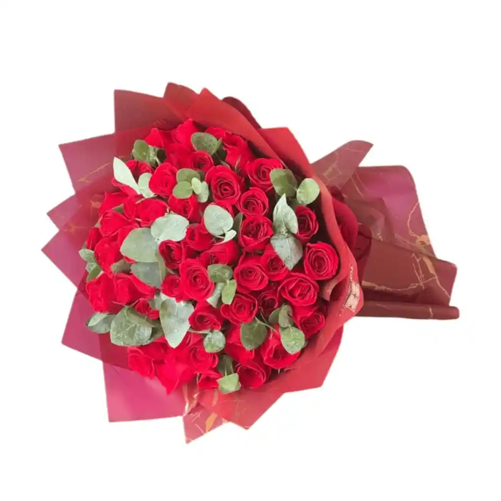 ramillete compuesto por 50 rosas frescas, acompañado de eucalipto dólar, envuelto en elegante papel coreano y decorado con un delicado lazo. Un diseño sofisticado y lleno de romanticismo, perfecto para sorprender con un detalle inolvidable y de gran impacto.