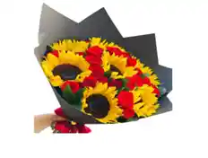 Bouquet con aprox. 7 girasoles 24 rosas rojas y rusco. Nota: La flor puede ser sustituida dependiendo la disponibilidad de color y del producto “Mensaje Personalizado” máximo de 30 caracteres (Dejar el mensaje en el chat, los comentarios no se previsualizan para la tienda por lo que si se dejan allí no podrá ser incluido).