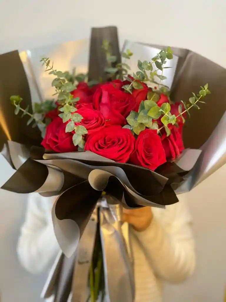 detalle redondo elaborado en 24 tallos de rosas, eucalipto baby, empaque en papel especial (tono sujeto a disponibilidad), lazo en cinta de tela.