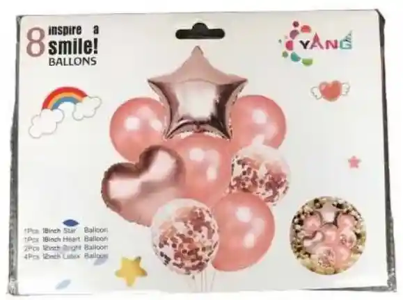 Bouquet 8 Globos Oro Rosa, incluye: Globos metalizados, bomba cristal con confeti R12 y Bombas Lisa R12.