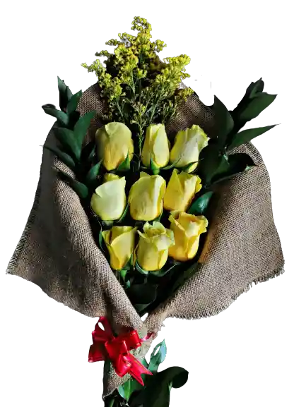 9 Rosas amarillas tipo exportación, 30 cm de largo, incluye decoración y tarjeta (indicar en el chat que mensaje desea)