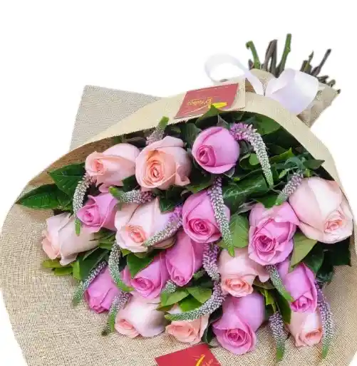 Bouquet alargado de 18 rosas rosadas acompañadas de follaje, decoradas con papel y moño