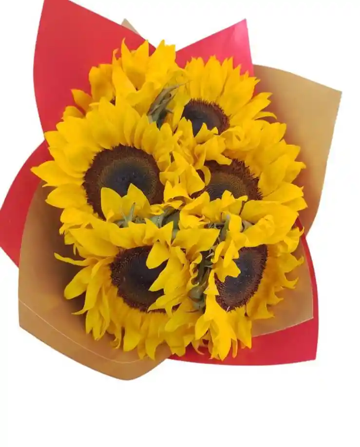 Bouquet compuesto por 6 girasoles con un toque de gipsofilia, decorado con papel coreano y terminado con un lazo.