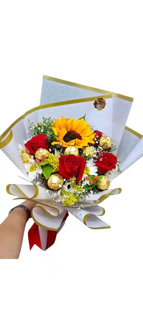 Ramillete conformado por un girasol acompañado de 5 rosas y follaje envuelto en papel coreano más un lazo ( la rosa varía el color)