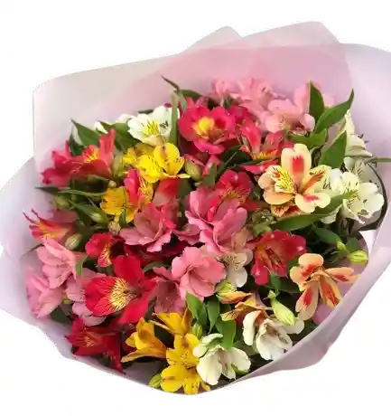Hermoso bouquet de alstroemerias en una mezcla vibrante de colores, acompañado de follaje natural y presentado con un estilo fresco y elegante. Flores frescas de calidad premium, seleccionadas y diseñadas profesionalmente para un arreglo lleno de color, alegría y personalidad. Algunas flores o complementos pueden variar según disponibilidad de temporada, manteniendo siempre la estética y valor del arreglo. Incluye tarjeta personalizada sin costo adicional. 🌸💐