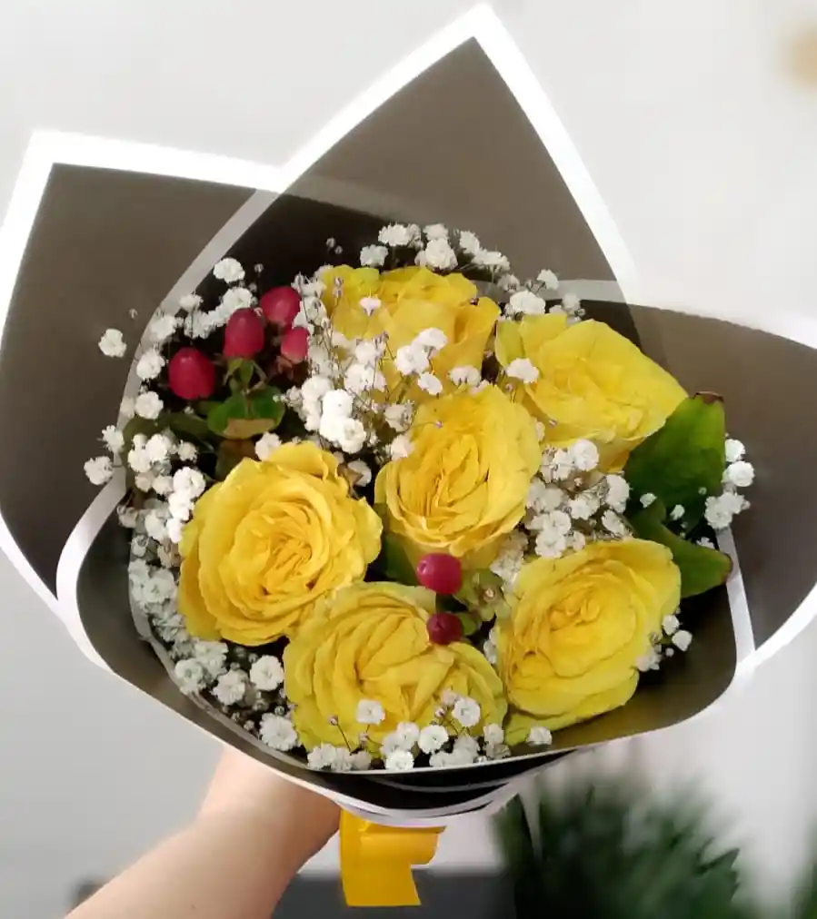 arreglo tipo bouquet elaborado con rosas amarillas acompañado de follaje, el tono del papel puede variar