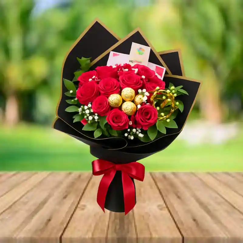 Elegancia, romance y un toque de lujo en un solo detalle. El Bouquet Amor Real de 12 rosas y 3 chocolates, combina la intensidad de las rosas rojas premium con la dulzura irresistible de los Ferrero Rocher, creando un regalo imponente y lleno de significado. Acompañado de delicada gypsophilia, follaje fresco y un empaque negro con bordes dorados que resalta su estilo majestuoso, este bouquet es perfecto para: ✨ Declaraciones de amor 💘 Aniversarios 🎁 Cumpleaños especiales 🔥 Sorprender a esa persona que merece sentirse única Un arreglo que expresa un amor que no solo se siente… sino que se honra. ❤️👑