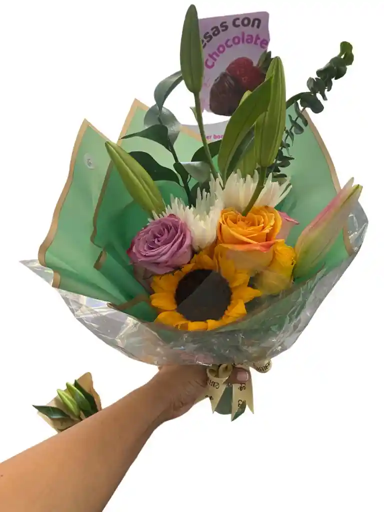 Un bouquet muy especial elaborado con un mix de una gran selección de flores frescas. - aproximadamente 12 tallos. Una experiencia de diferentes colores, texturas y aromas. Nuestro bouquet llega diseñado, con sus tallos pelados listo para ubicar en el jarrón de tu espacio. Ten presente que todos nuestros Arreglos Florales son diferentes y nacen de la creación espontánea a partir de la disponibilidad de flor, por eso no verás dos iguales.