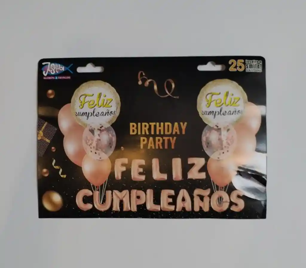 BOUQUET BOMBAS GLOBOS COMPLETO FELIZ CUMPLEAÑOS X 25 UDS ORO ROSA