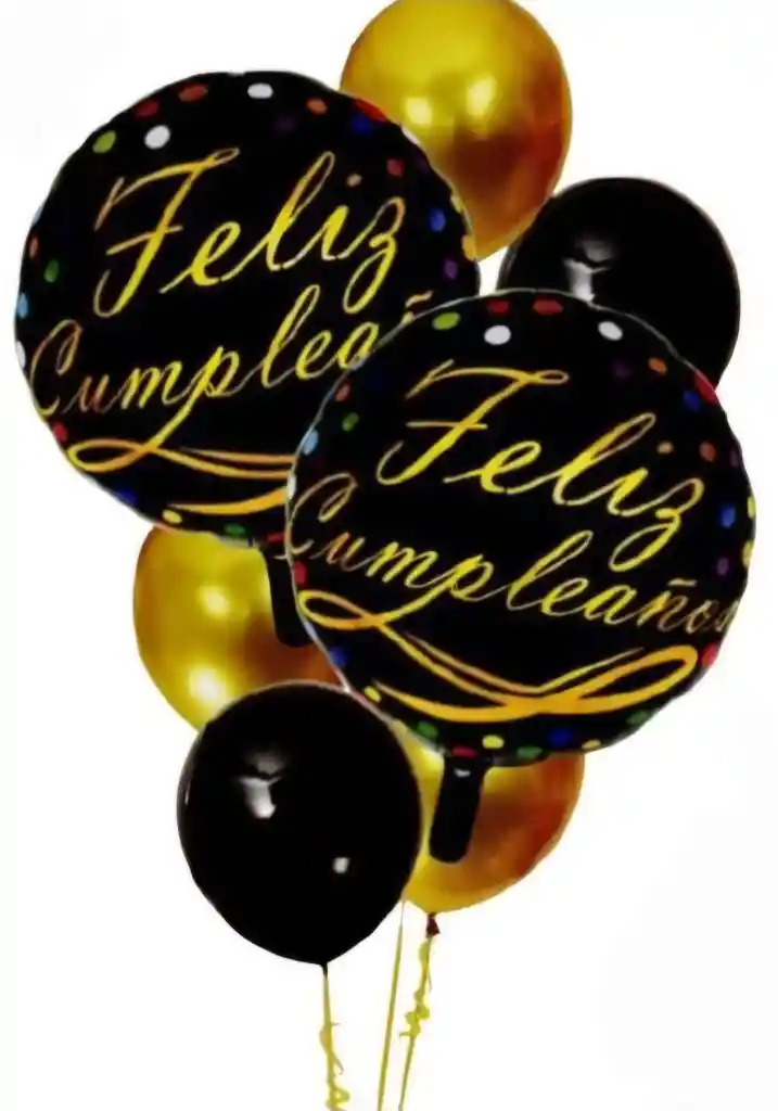 Dale un toque especial a cualquier cumpleaños con este hermoso bouquet. Incluye 2 globos metalizados y 5 globos de látex en sofisticados tonos dorado y negro. Ideal para sorprender y decorar con estilo. ¡Haz que el cumpleaños brille!