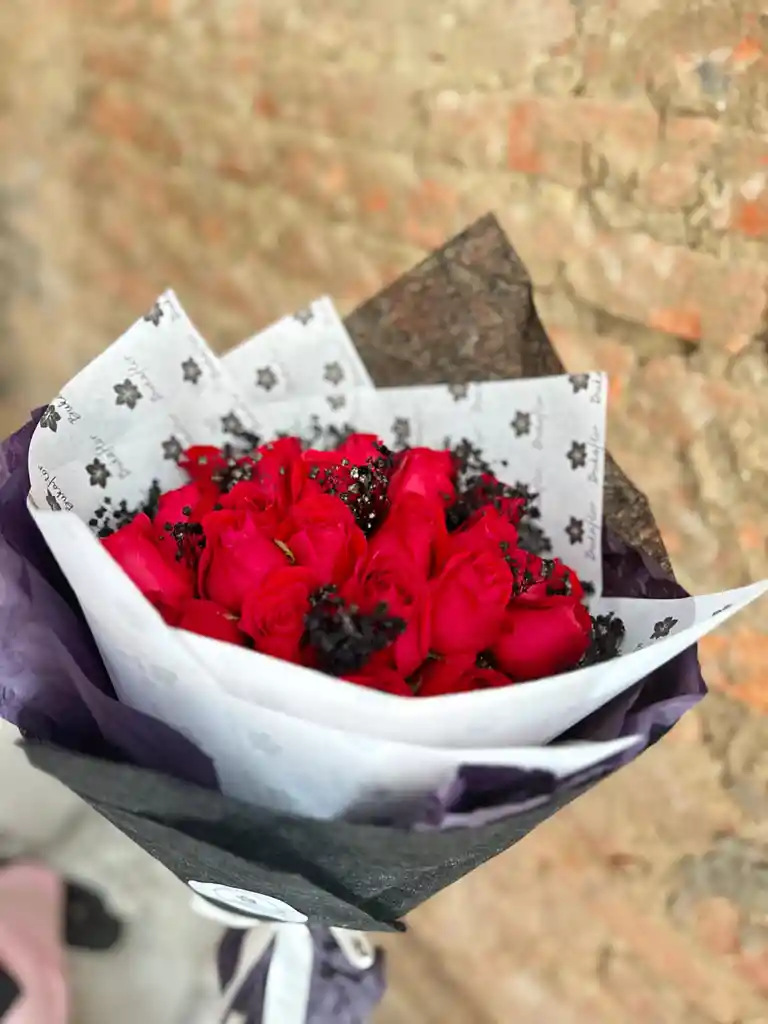 Este es un Bouquet floral que representa el amor, la pasión y la ternura. La forma más bella de representar lo que sentimos por la otra persona,recomendada para celebrar halloween o para esas chicas de amores goticos. Fabuloso para decir BOO-TIFUL, hermosa!, feliz Halloween Contiene: 24 Rosas Rojas. Decoración con Gipsófila negra Capucha Floral negra Cinta Blanca Tarjeta GRATIS.