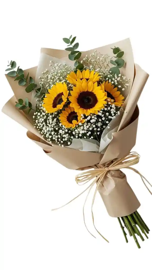 Bouquet brillo 5 girasoles en creativa envoltura y follajes incluye tarjeta