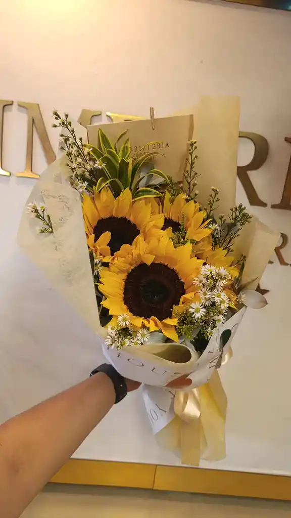 4 girasoles, 10 aster blancos, hoja de lino y mensaje personalizado