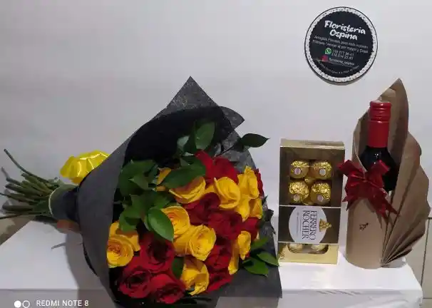 “Brindis de Amor Eterno” es una celebración al amor que no conoce límites, un encuentro entre la elegancia, la dulzura y la pasión. Un bouquet de rosas rojas y amarillas —pasión encendida y ternura dorada— se une a una caja de chocolates Ferrero Rocher y una botella de vino para decir, sin palabras, "te elijo una y mil veces más". Este conjunto está pensado para momentos inolvidables: aniversarios, celebraciones románticas o simplemente para sorprender con un gesto que perdura. 📌 Si deseas incluir tarjeta, recuerda solicitarla al realizar tu pedido. Sugerencia de mensaje: "Entre sorbos de amor y dulces promesas, deseo celebrar cada instante a tu lado." 📦 Nota: El tipo de empaque puede variar según disponibilidad en tienda. 🍷💛 Una propuesta exclusiva de Floristería Ospina, donde cada detalle florece con sentimiento y cada regalo se convierte en recuerdo.