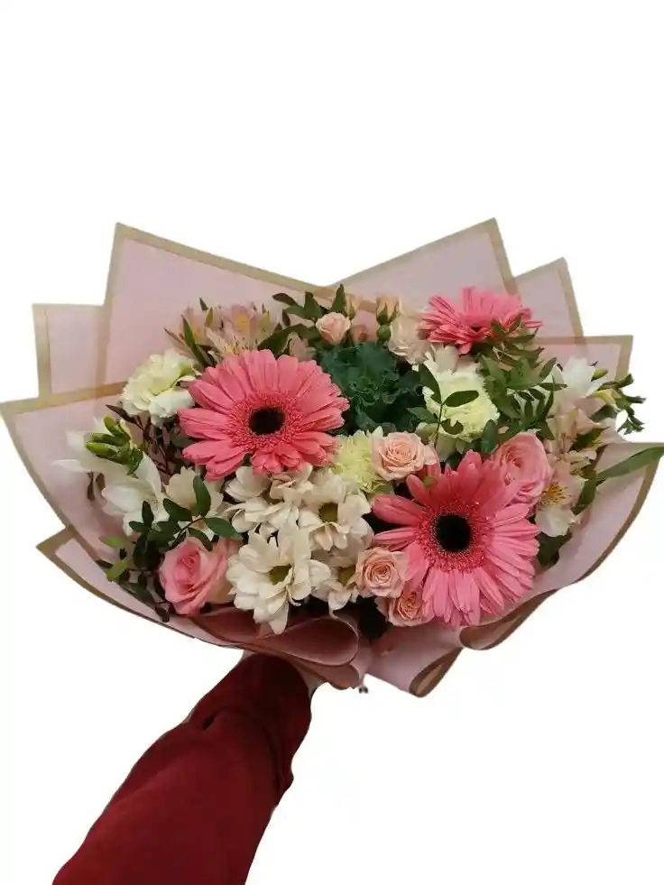 Bouquet de 3 gérberas rosadas, 2 varas de margarita blanca , 3 varas de rosa mini rosada , 6 claveles mix , 3 varas de astroemlia rosada y rusco Nota: La flor puede ser sustituida dependiendo la disponibilidad de color y del producto “Mensaje Personalizado” máximo de 30 caracteres (Dejar el mensaje en el chat, los comentarios no se previsualizan para la tienda por lo que si se dejan allí no podrá ser incluido).
