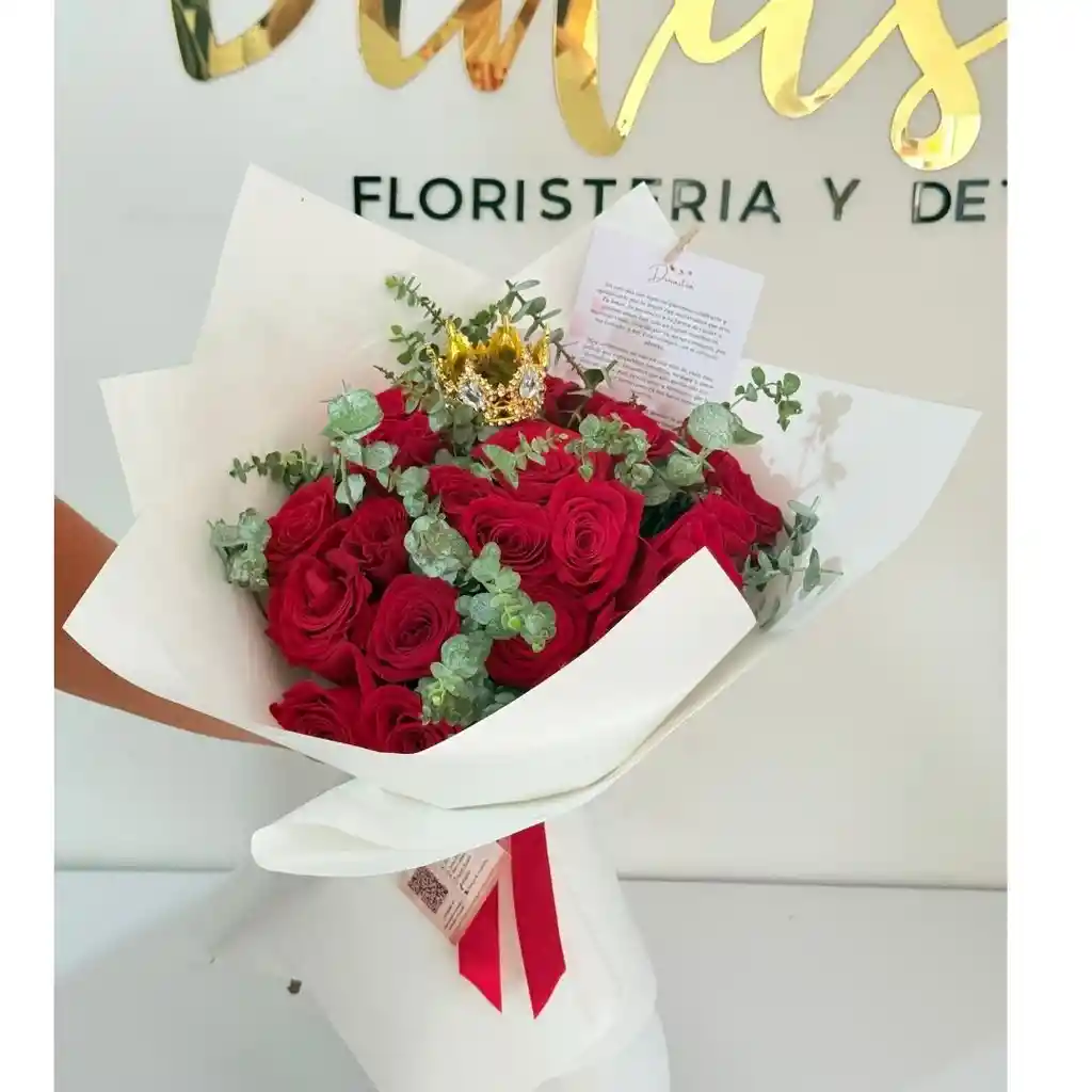 Bouquet de 24 rosas rojas naturales con papel decorativo de lujo (coreano o kraft), lazo de cinta satinada a juego y tarjeta personalizada de San Valentín. Ideal para sorprender hoy mismo con un detalle elegante y romántico.