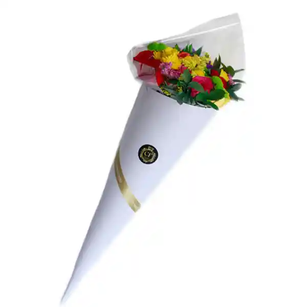 !Hermoso bouquet de flores campestres ideal para iluminar el dia de tu ser querido! El bouquet viene envuelto en papel seda y papel celofán, en un cono blanco de lujo de aproximadamente 81cm de largo y cinta dorada de Crown Flowers. ¡Acompáñalo con mensaje dedicatorio!