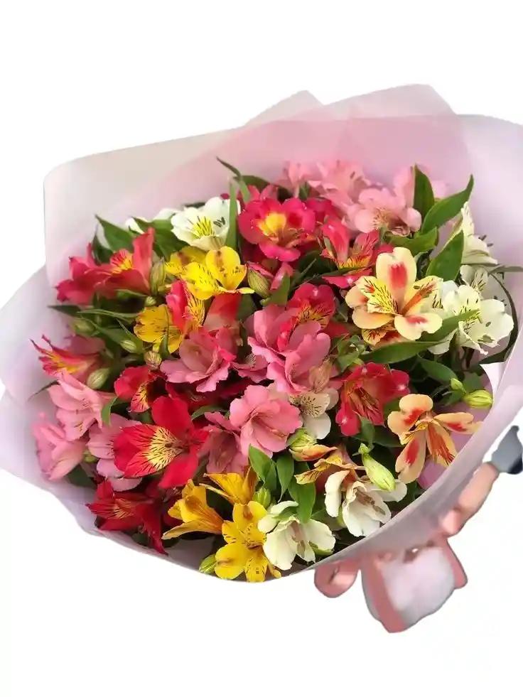 Un bouquet vibrante con aproximadamente 10 varas de astromelias en distintos colores, ideal para expresar alegría y cariño con su hermosa combinación de tonos. Nota: La flor puede ser sustituida dependiendo de la disponibilidad de color y del producto. "Mensaje Personalizado" máximo de 30 caracteres (Dejar el mensaje en el chat, los comentarios no se previsualizan para la tienda, por lo que si se dejan allí no podrá ser incluido).