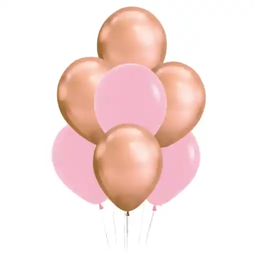"Bouquet de 7 globos en helio. Incluye: - 3 globos rosado pastel en látex - 4 globos oro rosa en látex - Pesa sencilla Todos los globos contienen helio y gel de larga duración (3 días de duración). "