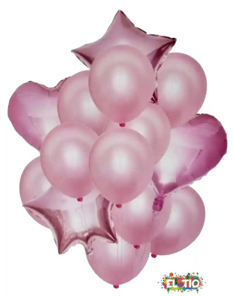Bouquet combinado Rosado 14 piezas 2 globos metalizados corazon rosado 18´´ 2 globos metalizados estrella rosados 18´´ 10 bombas R12 rosadas