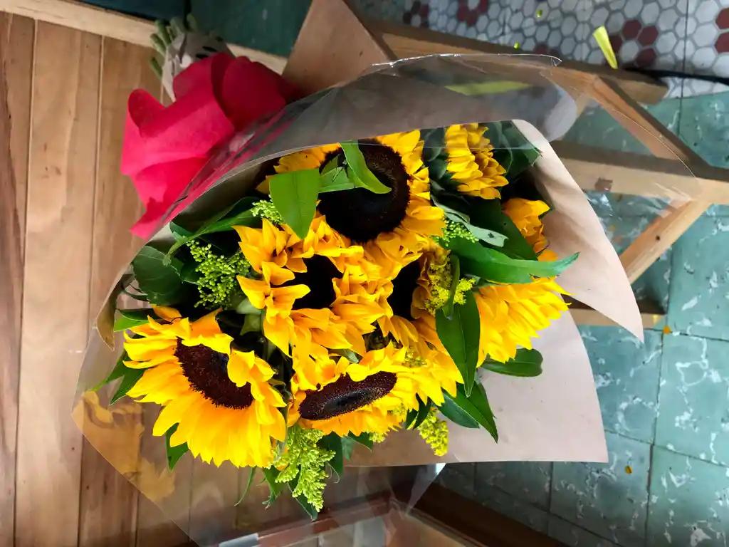 INCLUYE: 8 Girasoles Follaje 1 Papel Kraft 1 Celofán 1 Moño decorativo Para escribir un mensaje para la tarjeta déjala en nuestro chat.
