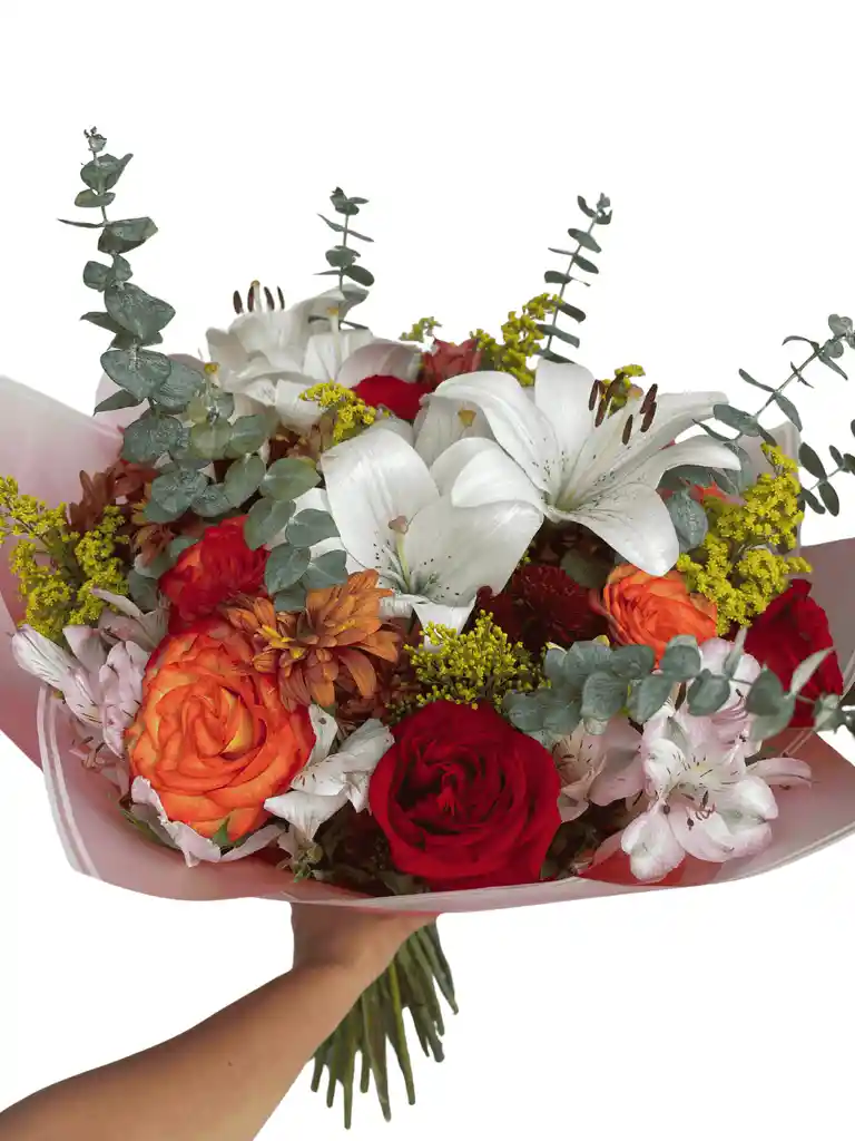 Vibrante bouquet con flores rojas y naranjas, combinado con margaritas, lirios blancos y eucalipto fresco. 🌹🌼 Un arreglo lleno de color, aroma y elegancia natural, ideal para regalar alegría, amor y energía positiva.