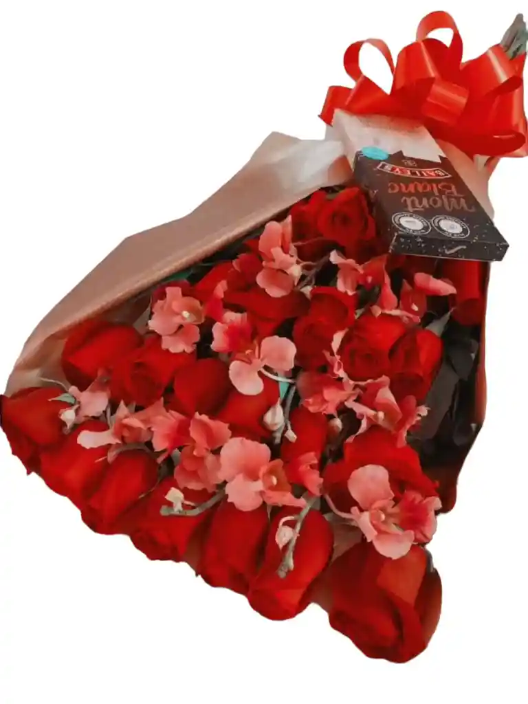 Bouquet con docena de Rosa Roja, con follajes surtidos, envuelta en Papel Coreano.