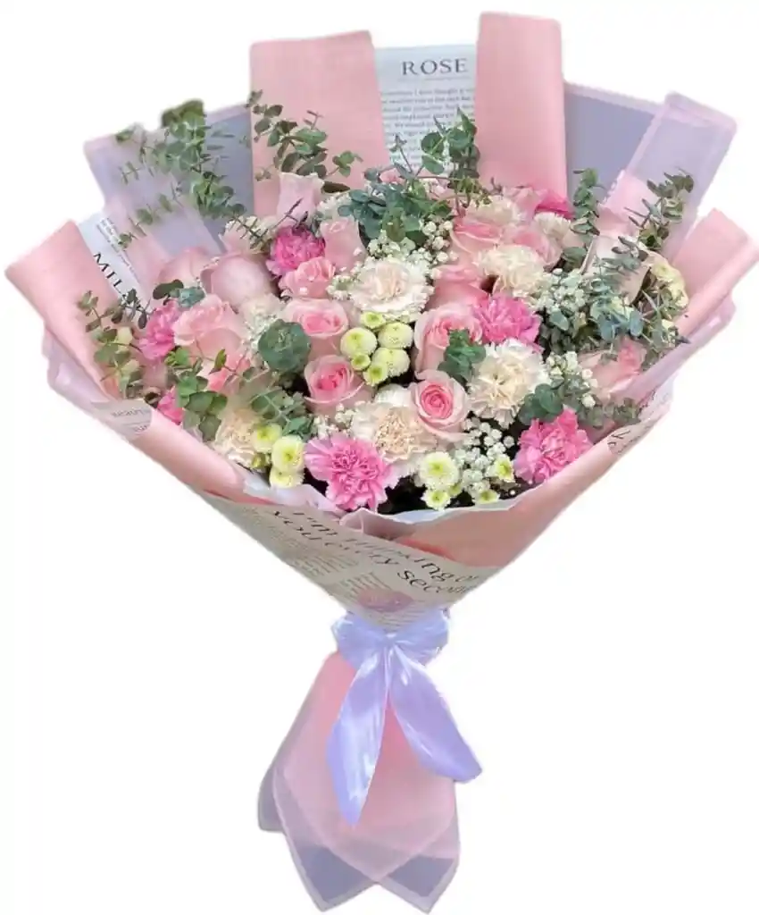 Bouquet Con Rosas Rosadas , Claveles , Eucalipto , Perla