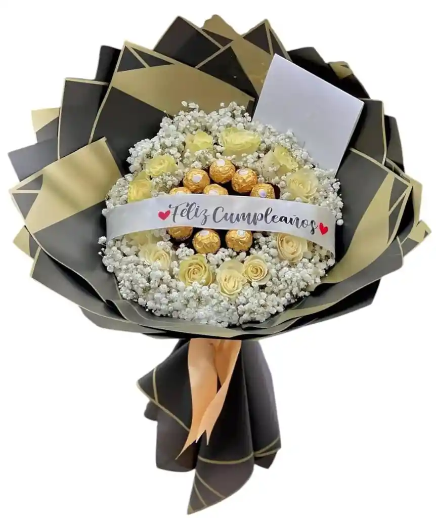 BOUQUET CON 15 ROSAS BLANCAS , PERLA 9 CHOCOLATES FERRERO ROCHER