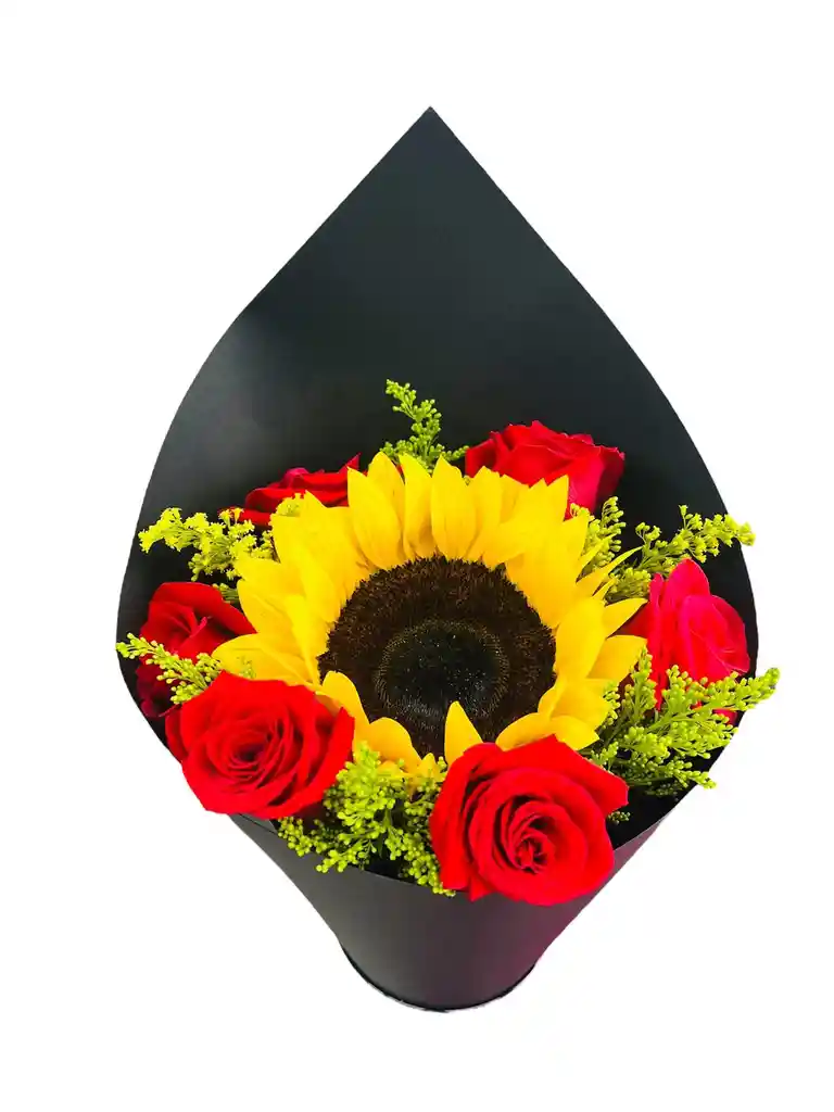 Arreglo floral x6 rosas tipo exportación en tonalidad rojo + girasol Follaje fino brillantina, solidago Moño en satín rojo Bonche transparente Papel cartulina negro