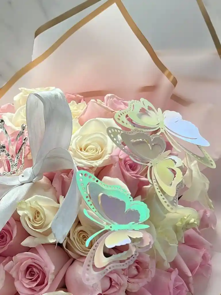 HERMOSO BOUQUET DE 50 ROSAS COLOR PASTEL DECORADO CON MARIPOSAS Y CORONA MINI