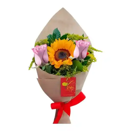 Bouquet de 1 girasol y 2 rosas rosadas, con follaje, papel y moño