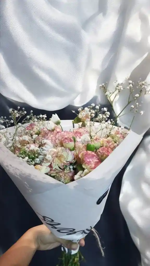 Bouquet con aprox. 10 claveles y gypsophila. Nota: La flor puede ser sustituida dependiendo la disponibilidad de color y del producto “Mensaje Personalizado” máximo de 30 caracteres (Dejar el mensaje en el chat, los comentarios no se previsualizan para la tienda por lo que si se dejan allí no podrá ser incluido).