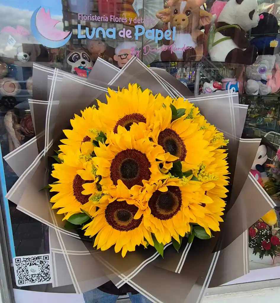 Arreglo en bouquet con 12 girasoles , con paples decorativos y cinta