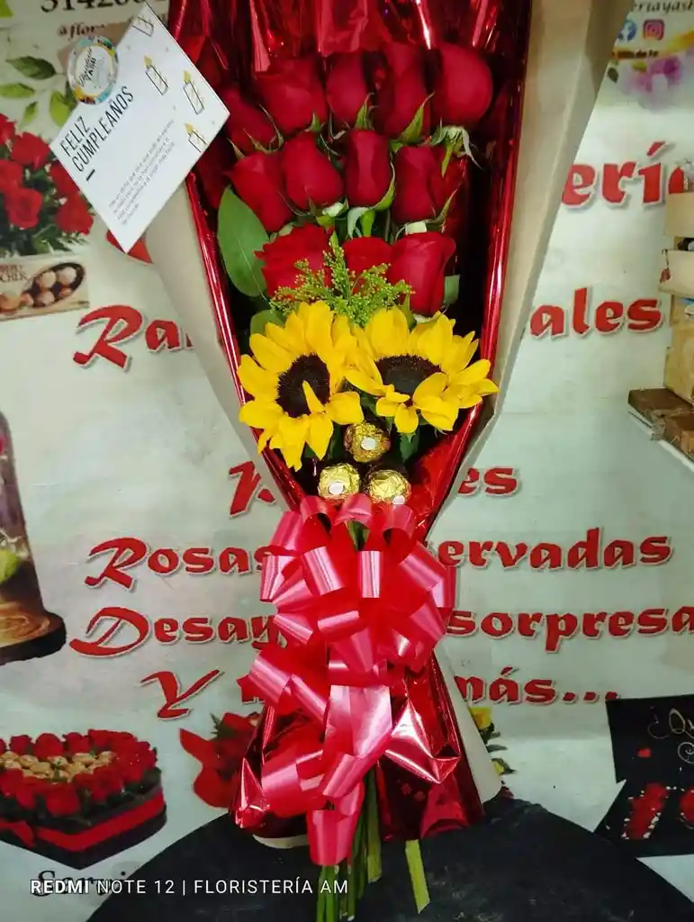 hermoso bouquet de rosas con girasol, acompañado de 3 chocolates ferreros, y decoración.
