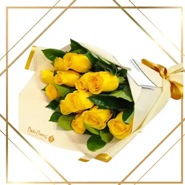Bouquet de 12 rosas con finos follajes y tarjeta personalizada.