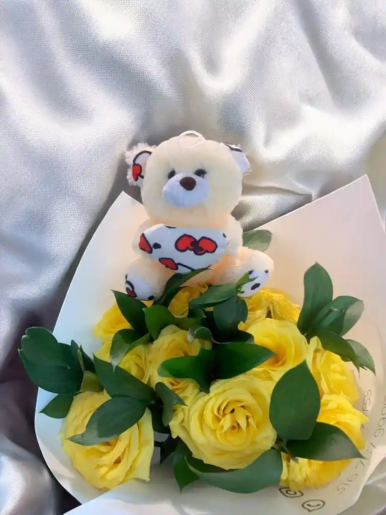 Bouquet con aprox. 12 rosas amarillas con rusco y un oso. Nota: La flor puede ser sustituida dependiendo la disponibilidad de color y del producto “Mensaje Personalizado” máximo de 30 caracteres (Dejar el mensaje en el chat, los comentarios no se previsualizan para la tienda por lo que si se dejan allí no podrá ser incluido).