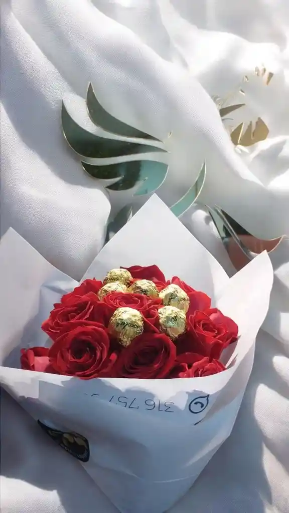 Bouquet de 12 rosas rojas con chocolates. Nota: La flor puede ser sustituida dependiendo la disponibilidad de color y del producto “Mensaje Personalizado” máximo de 30 caracteres (Dejar el mensaje en el chat, los comentarios no se previsualizan para la tienda por lo que si se dejan allí no podrá ser incluido).