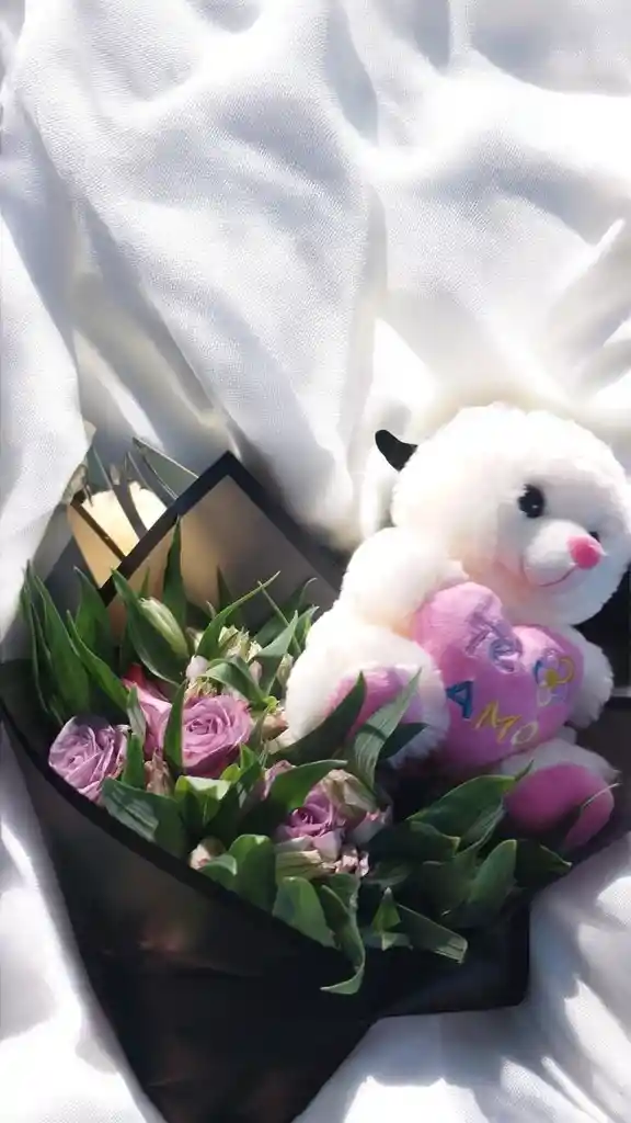 Bouquet de 12 rosas moradas acompañadas de astromelia y peluche pequeño. Nota: La flor puede ser sustituida dependiendo la disponibilidad de color y del producto “Mensaje Personalizado” máximo de 30 caracteres (Dejar el mensaje en el chat, los comentarios no se previsualizan para la tienda por lo que si se dejan allí no podrá ser incluido).